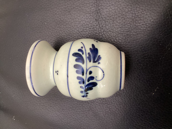 Miniature vase with top decreasing in size then coming out again to form the body and tapering in to create the base