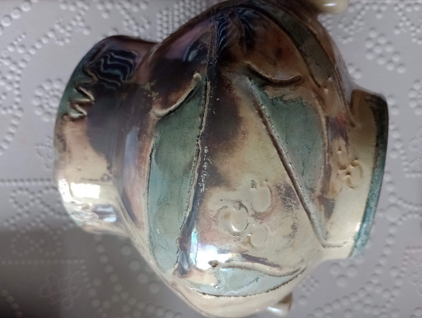 Pot met 2 kleine oortjes, abstract geglazuurd in groenige en bruinige tinten