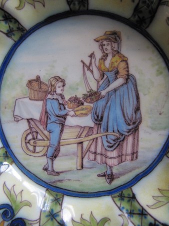 Het kleurrijke stel borden is vervaardigd van aardewerk met een tinglazuur. De vorm met de geschulpte rand en de kleurrijke decoratie doet vermoeden dat ze in de late 19e of 20ste eeuw zijn vervaardigd. Het betreft geen Delfts aardewerk, maar het merk is ons tot op heden onbekend. We hopen dat andere bezoekers van de site zullen reageren als zij het merk kunnen identificeren.