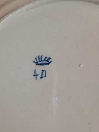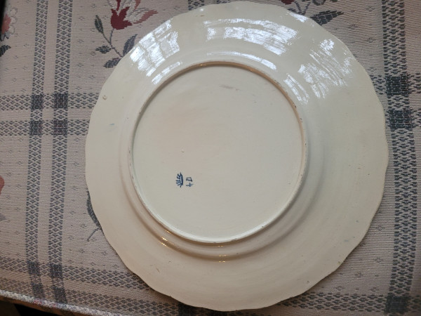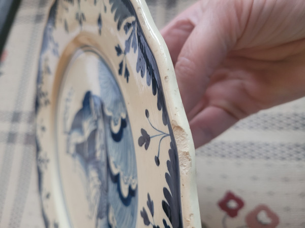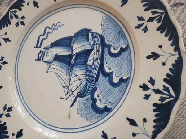 Hand painted earthenware pate with dark cobalt decoration depicting a ship at sea. Modest scalloped rim with alternating sprig motifs and fernlike leaf pattern. Minor glaze pops and chipping on the edges.