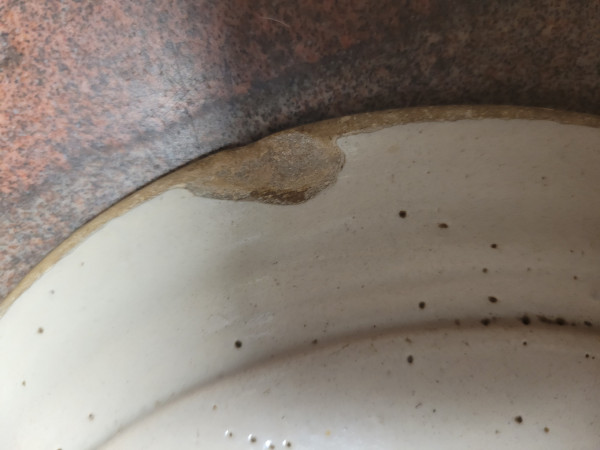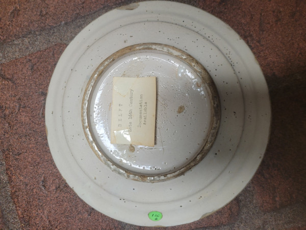 Thickly thrown tin glazed pottery plate, purported to be 16th century Delft. Documentation is missing. Most of the rim glaze has chipped off. Buff colored material exposed on edges.