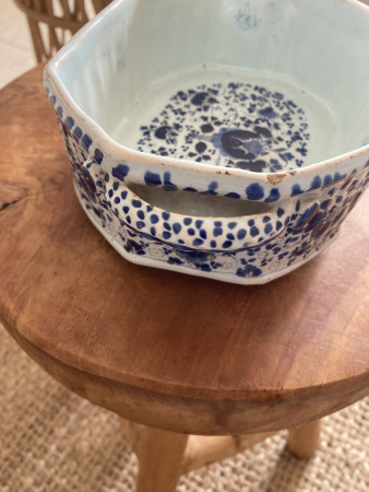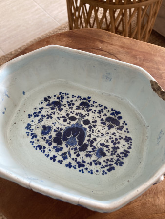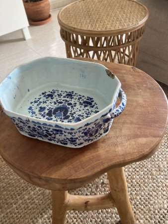 Ik denk dat het een jardinière is of anders een drank koeler. Het lijkt Delfts van einde 18de eeuw of begin 19de eeuw, maar met volle overtuiging durf ik dat niet beweren.