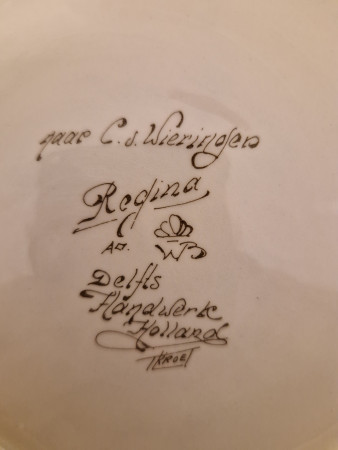 Celle-ci est peinte à la main, mais n'est pas de la véritable poterie de Delft. Manufacture de faïence Regina. L'usine a été fondée en 1898 à Gouda, l'année où la reine Wilhelmina a été couronnée par Van der Want et Barras (WB). Le nom « Regina » (latin pour reine) est donc un hommage à celle-ci.