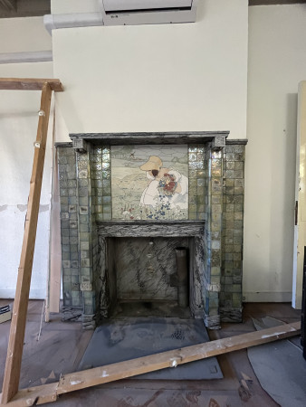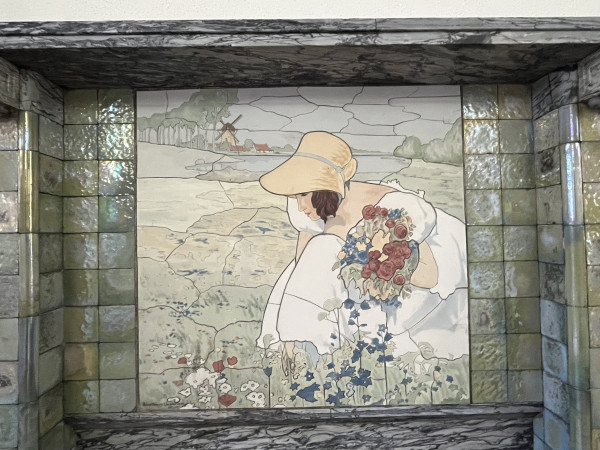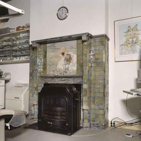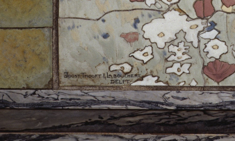 Het tegeltableau bevindt zich op een schoorsteenmantel van een pand uit 1910 in Arnhem. Linksonder gesigneerd: JoostThooft & Labouchere Delft