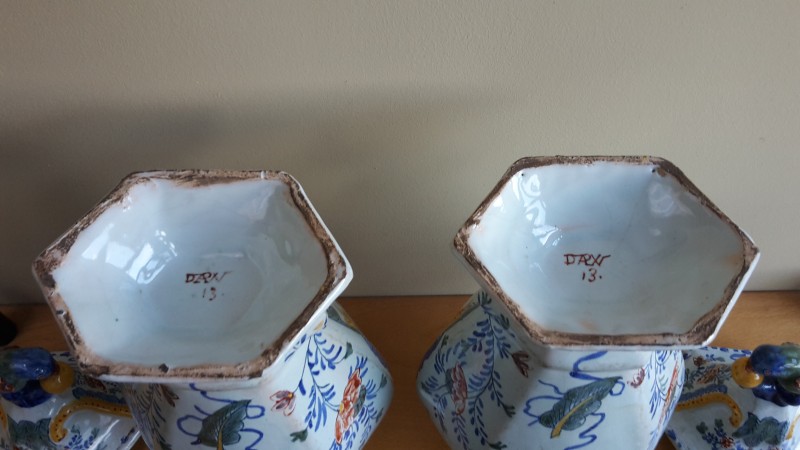 Spijtig genoeg zijn deze vazen moderne kopies, waarschijnlijk Noord-Frans met een pseudo-delfts merk.Vrg,