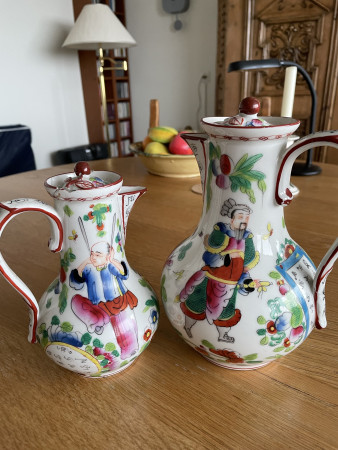 D Dhyan 2 gekleurde sier kannen 2 Voorwerp Merk met Chinese voorstellingen Vraag zijn deze kannen Chinees porselein? Afmetingen 1 hoogte 21,5 cm 2hoogte 17,5 Collectie publiekscollectie