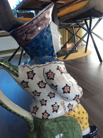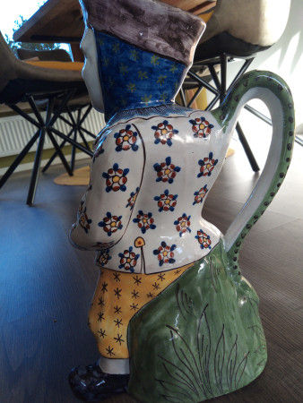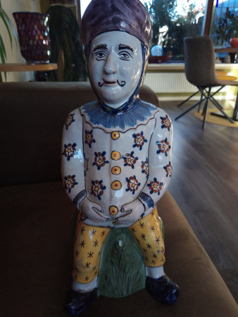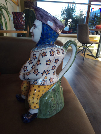 Betreft een ' vaas' met groot handvat en man met dikke buik die op een ' rotsblok ' zit.. onder het beeld staat B:P handgeschreven.