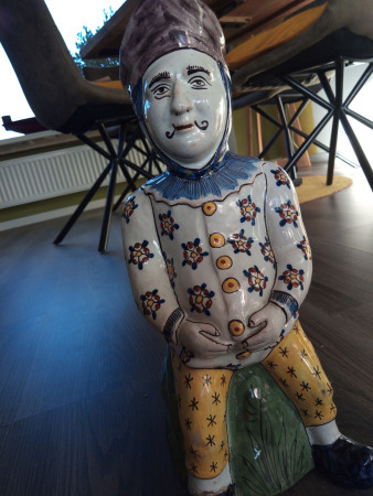 Ride klei, wit geglazuurde en hand beschilderd. Wil graag meer info.