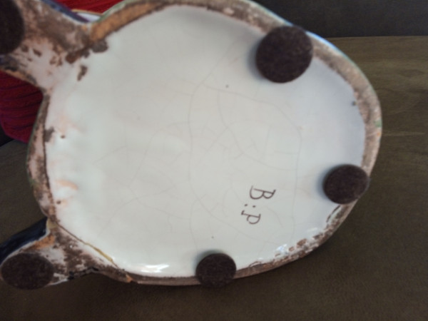Het is gemaakt in (vermoedelijk) Frankrijk eind 19de of in de 20ste eeuw. Het is dus niet Delfts. Het merk is voor Delftse fabriek De Blompot en dus vals.