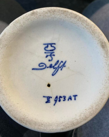 De foto's met de gaatjes lijken mij tweemaal dezelfde foto. geschilderd door F;de Fauw . Vermoedelijk zijn de gaatjes er achteraf ingeboord. Vandaar de haarlijnen rond het gaatje. Zijn ze onbruikbaar gemaakt omdat er een ander goedje in gezeten heeft en om zeker te zijn dat ze niet hergebruikt worden? Poging om er een lamp van te maken? Wie zal het zeggen.