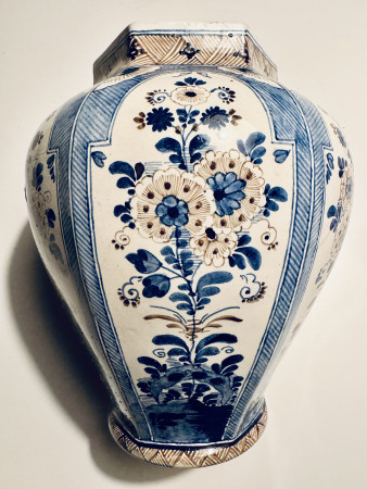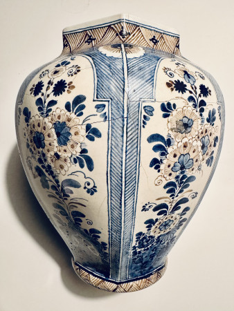 De vaas is opgedeeld in vlakken, gescheiden door blauwe banen.( wat nieuw was in die periode). In de hoofdvakken zien we weelderige pioenrozen en fijne bloemmotieven,
