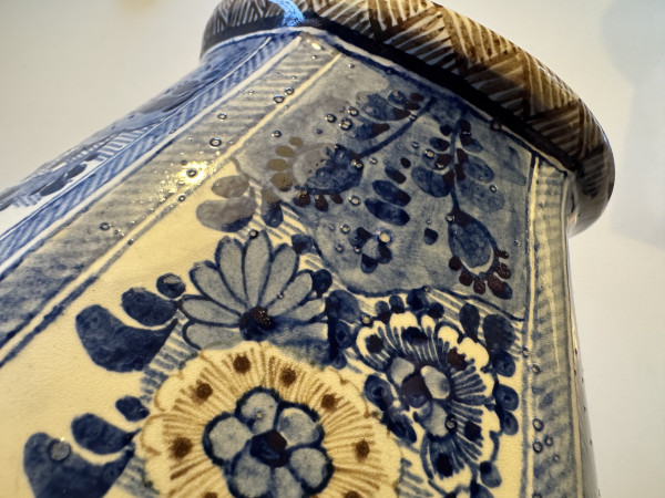 Deze pul heeft een afwijkende schildering in blauw met rode/bruine accententen, die ik niet eerder heb gezien. Ik denk jaarcode F te kunnen zien en dat zou betekenen dat deze pul uit 1884 komt. Het signatuur van de schilder kon ik niet achterhalen.