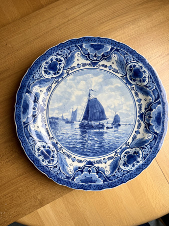 Verkregen uit een erfenis. Blauw gedecoreerd met zeilschepen op voorgrond en kerktorentje aan de horizon. De rand van het bord is geschulpt.