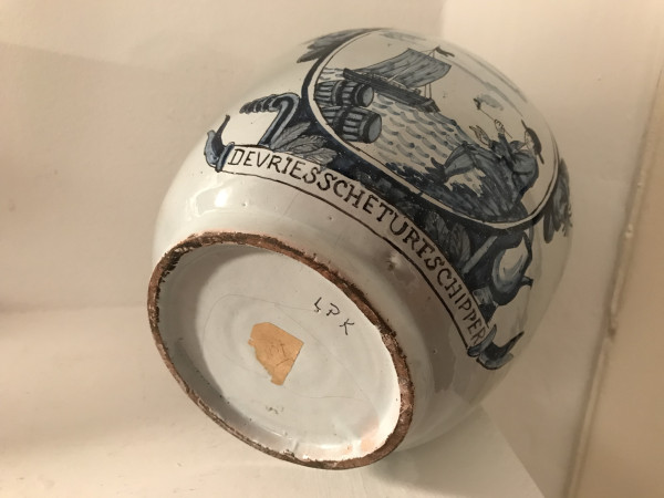 Grijze pot met blauwe decoratie. Schip met pijprokende man. Met opschrift ‘Devriesche turfschipper. Gesigneerd aan de onderkant met LPK.