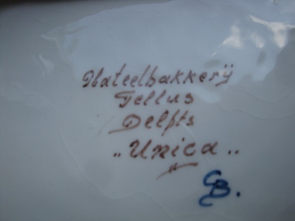 Geachte, is gemaakt bij het zzp bedrijfje Tellus, plateelschilder/eigenaar was Cornelis (Cor) Brenkman (1933-2015), Nieuwerkerk aan den IJssel, er zou werk van hem (topstukken), in Rusland bevinden, was een broer van de plateelschilder Bob Brenkman (1946-2016), groet, jvdh.