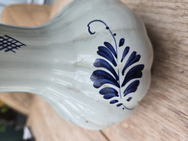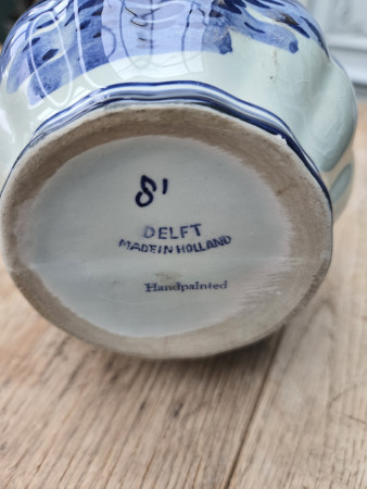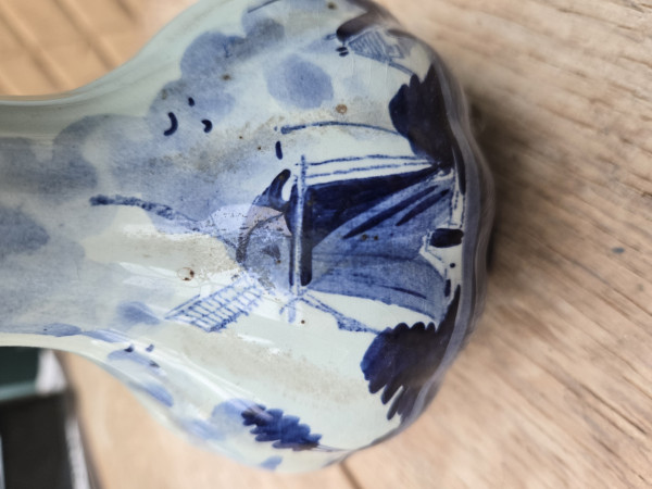 H Heidy Vaasje 0 Voorwerp Decoratie Bol vaasje met hoge hals, molen erop Vraag Is het origineel delftsblauw of gewoon replica? Afmetingen Ongeveer 17, 5 cm hoog, Collectie publiekscollectie