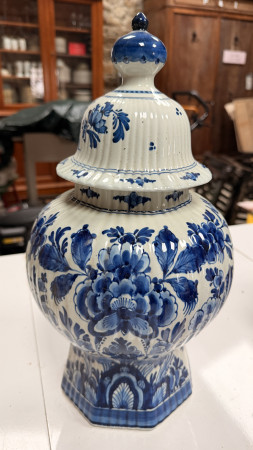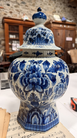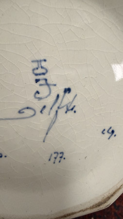 Gemaakt bij de porceleyne fles uit Delft ( Flesje JT) in 1962 ( ik lees CG ) en geschilderd door van Wolferen die er schilderde van 1961 tot 2003. Signeerde ook met WVO. 177 is een intern nummer. Hieronder een gelijkende vaas uit 1953.