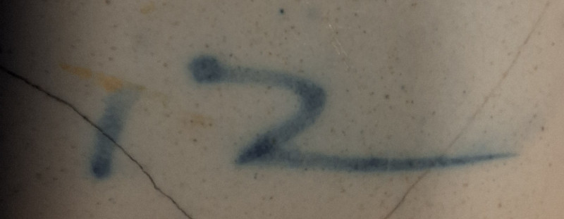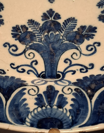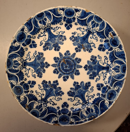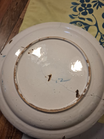 Wat ik denk te zien is een oud Delftsblauw sierbord met een bloemversiering in 6 vazen. Het heeft een behoorlijke intense blauwe keur. Het is niet echt fijn geschilderd. Op de achterkant een merkteken wat niet goed te definieren is. Een 12 met een uitgelopen 2, een mislukte bijl? Kan er geen mayonaise van maken, Oja gevonden vandaag op een rommelmarkt in Frankrijk. Ik weet niet of in Nederland op dezelfde manier, met agrafes, borden werden gerepareerd?