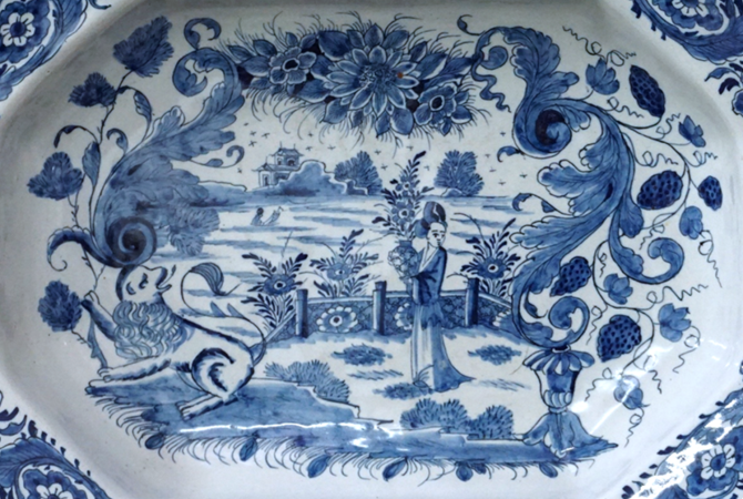 Er zijn géén sporen van proenen, Is dit een 18de -eeuwse Delftse schotel of is het een Franse 19de -eeuwse kopie? (De schotel is in mijn bezit, de foto's zijn deze genomen van het veilinghuis waarvan ik het bekomen heb).