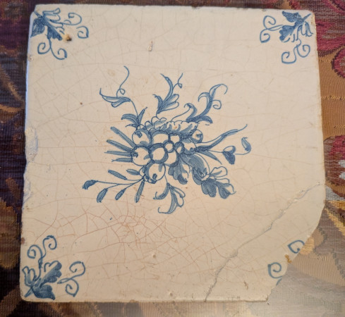 These are architectural tiles we recently purchased at a shop in Delft. We were told they are late 17th century. The one with the broken corner has oak leaf corner ornaments that are said to be rare. The tiles were removed from an architectural setting with remains of plaster on the backs, so any marks are not visible.