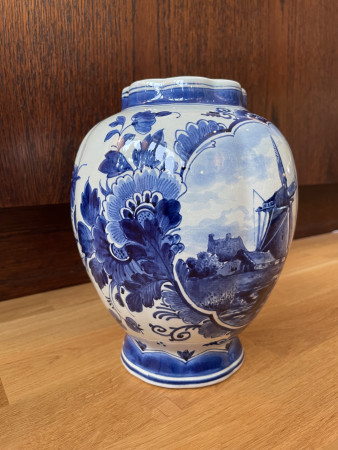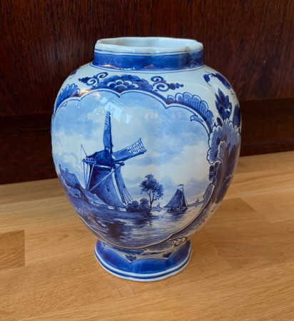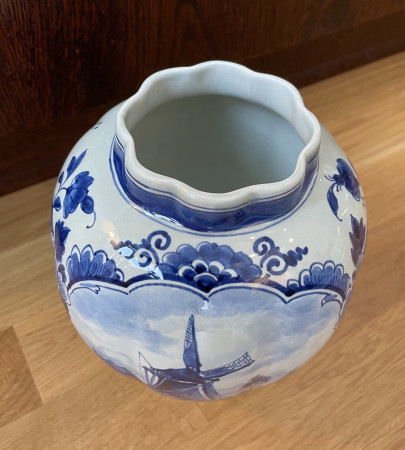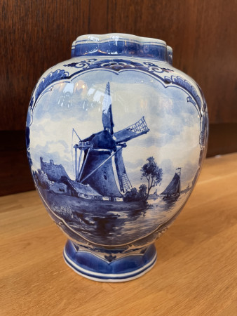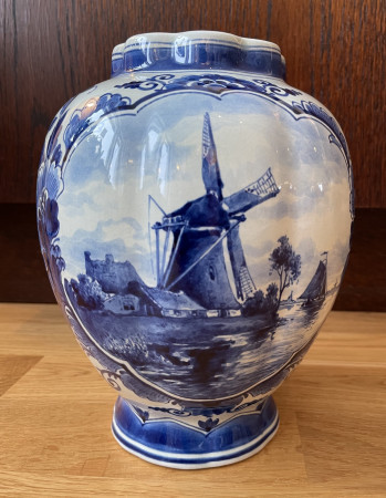 A Vase with the mark of Royal Delft. Blue and white, appears hand painted. Painting of a windmill by the water with houses and a boat.
