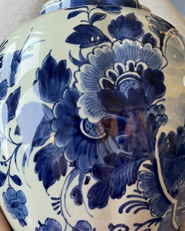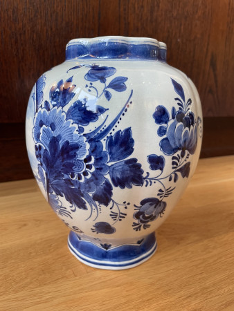 This vase was painted by two painters in 1934 (BD). Theo van Lingen (1893-1945) probably painted the landscape and G. van Heijenoort (1891-1940) the border decoration. It is an "A" design that at the time was sold slightly cheaper due to, for example, a flaw in the glaze, the painting, or other matters.
