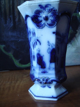 2 blauw witte bekervaasjes zonder stempel 21,5cm hoog, orientaalse scene jongen met granaatappel