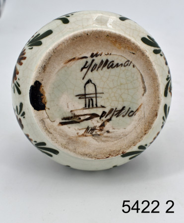 K Koos van Veen vaasje 1 Voorwerp Merk kalebasvormig vaasje Vraag wie herkent de merktekens en hoe oud is het ongeveer Afmetingen 15 cm Collectie publiekscollectie
