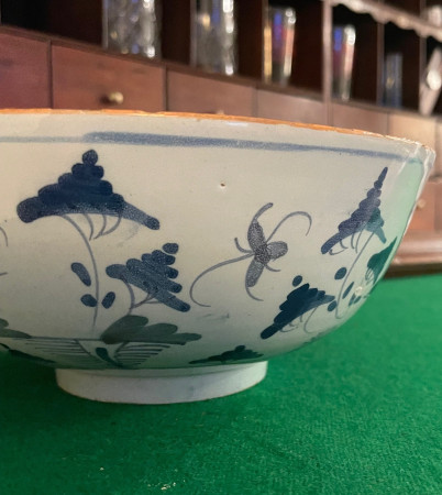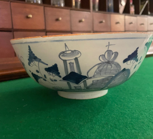 Tea bowl with phrase: "My Wife Drink, So Fill a Gain". Indentation on the bottom is triangle-shaped. Chips on the lip show red and buff colored clay. Sides of the bowl show leaves, trees, a church with a cross, a tower, and a bird.