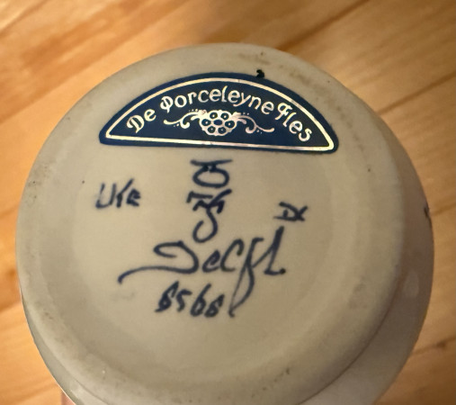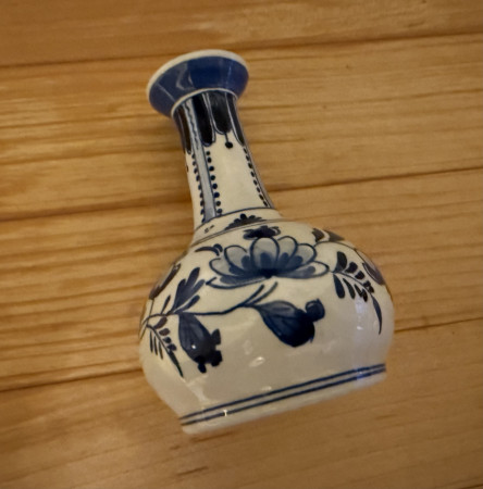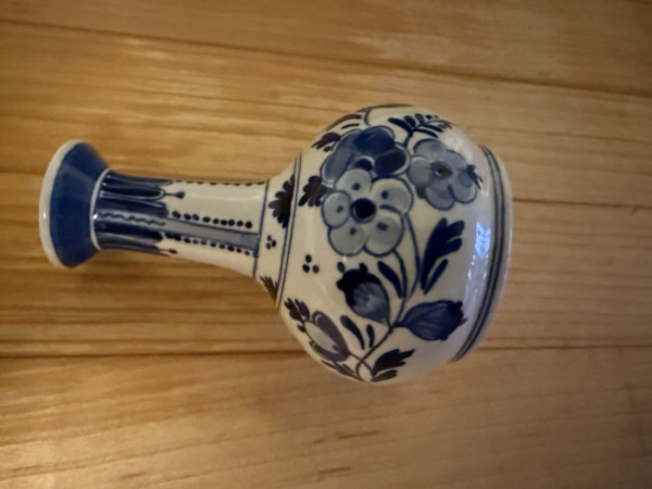 L lilablaangel@h… Bud vase 0 Voorwerp Merk Decoratie Small blue and white bud vase with flowers on it Vraag When was it made and where? Afmetingen 9cm Collectie publiekscollectie