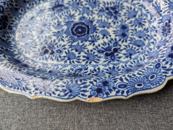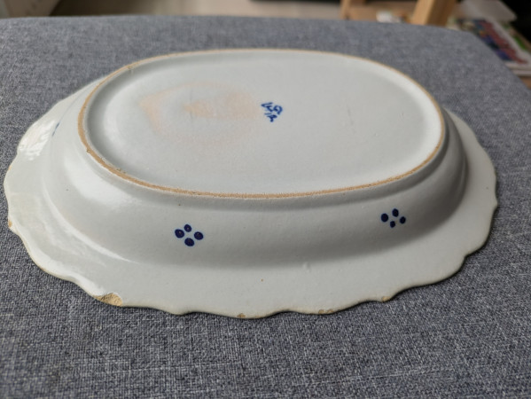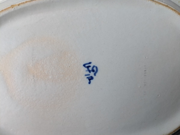 Ik geloof dat dit bordje/schaal echt Delfts Blauw aardewerk is. Een soortgelijk bordje zag ik namelijk op deze site staan, maar dan met een zilveren hengsel eraan. Maar het merk teken is anders en ik kan niet achterhalen wat voor teken het is.