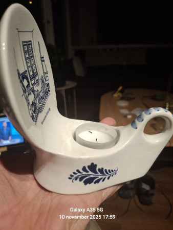 M Macao54 waxinelichtje/ nachtlichtje 0 Voorwerp Merk Decoratie Waarschijnlijk in opdracht gemaakt. Op het schild staat bedrijfsnaam Vraag Is het echt delftsblauw Afmetingen +/_ 12 x 20cm Collectie publiekscollectie