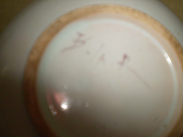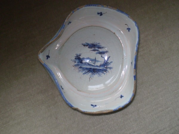 kommetje met schenktuit, binnen beschilderd met een bootje, op de voorgrond een boom, buitenkant gedecoreerd met bloemmotief