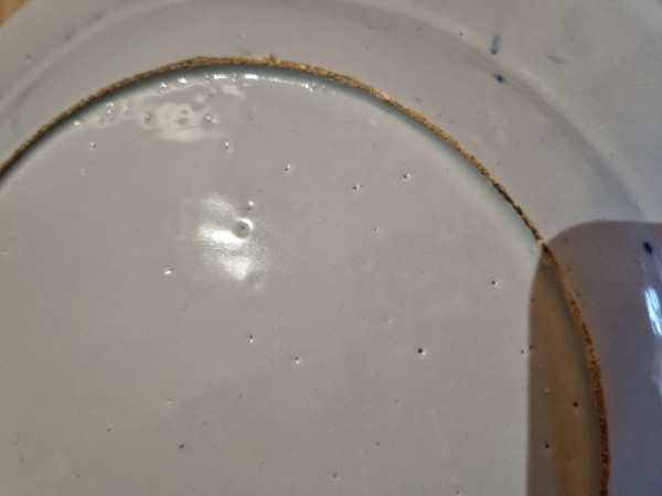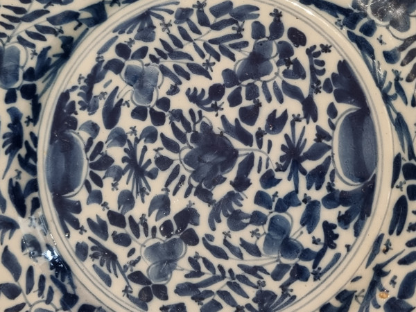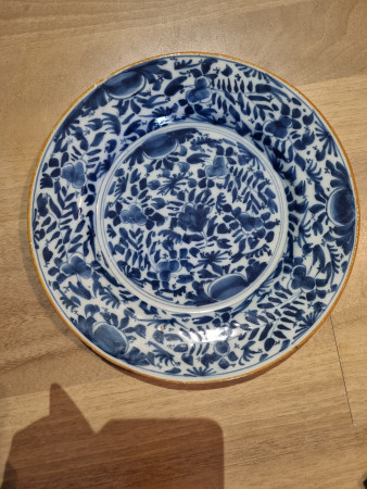 M Mariska Bord of schotel 2 Voorwerp Materiaal Decoratie Bord met blauwe decoratie van bloemen. En okerkleurige rand. Vraag Is dit Delfts en hoe oud is het? Afmetingen 23 cm diameter Collectie publiekscollectie