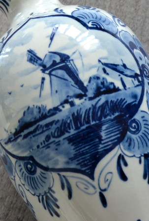 Het Bottle / baluster shaped . Metode glazuuraar met stop is versierd in blauwtinten. Thema een cartouche met een molen (Bovenkruier) met uzicht een Hollands landschap en bloemen.