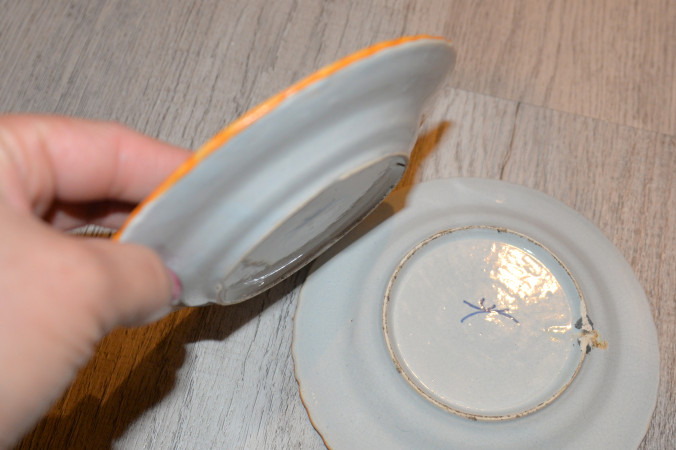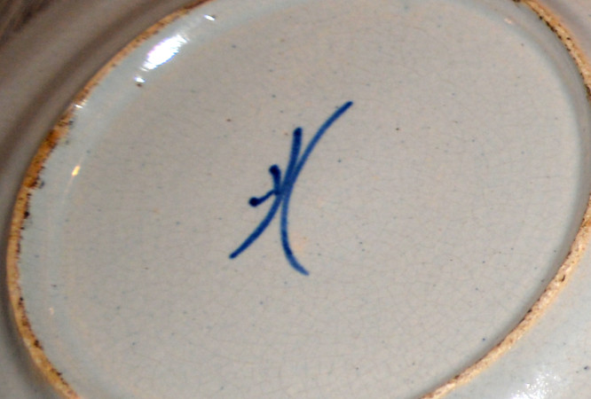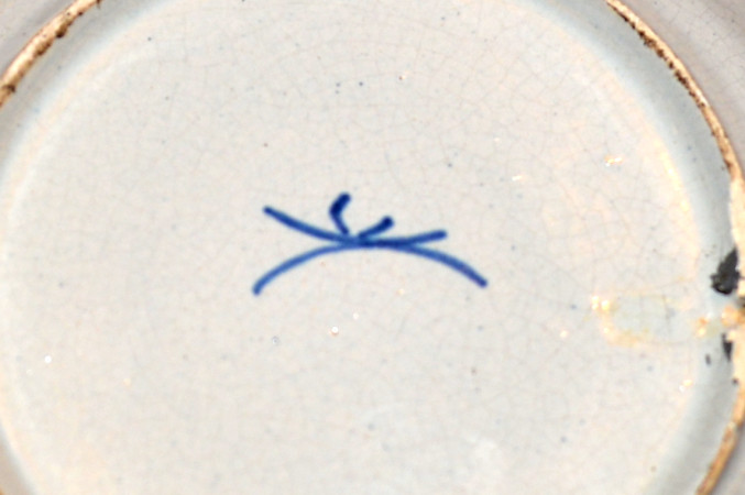 Op bord is vaas met drie bollen noemt pauw. De rand is donker geel . Ik zie ook veel patiena en nnvolkomenheden van schade. Op de achterkant is een merk copie van de Klaauw
