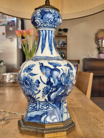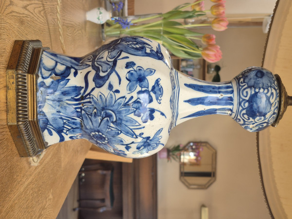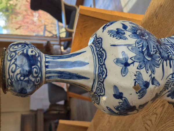I suspect this is not an authentic Delft vase, the marks are either missing or hardly visible. Besides, the metal base has been glued to the vase, partly covering the ceramic surface.