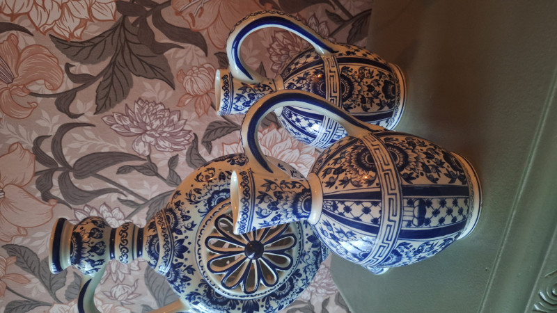 Is dit een Delfst blauwe kruik? Is hij authentiek, of namaak? Uit welke jaartal is deze kruik en wat zou ongeveer de waarde kunnen zijn. Ik heb er ook nlg twee kleine kannetjes bij. Is dit een set, of horen ze niet bij elkaar. En waar komen de kannetjes vandaan?