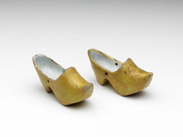 klomp (schoeisel), miniatuur Eén van twee miniatuurklompen, geel aan de buitenzijde, wit aan de binnenzijde Lees meer Code AB 8609b Unieke code Museum Arnhem AB 8609b