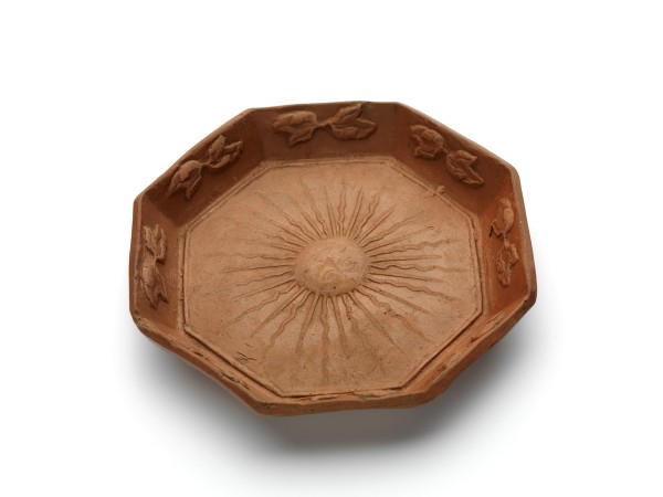 Achtzijdige pattipan met vlakke bodem met schuin oplopende wand. Lichtrood, bijna oranje. Decor in reliëf: op bodem in het midden een zon, bij overgang naar wand een profiellijst, op acht zijden twee aan elkaar gekoppelde bladeren.