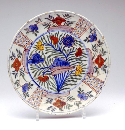 Bord in Chinese kraakstijl met op het plat bloemtakken en op de rand vakken met rotspartijen en bloemen alternerend met vakken met servetwerk.