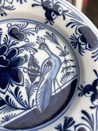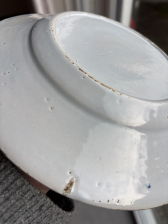 Bord met afbeelding van een pauw en bloemen. zijkant waar op meerdere plekken chipjes van glazuur (?) mist. Drie evenredig over de achterkant van het bord verdeelde grotere 'deukjes.