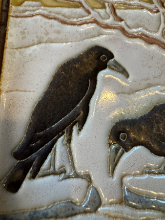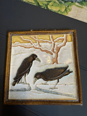 Kleine tegel, winterlandschap met 2 kraaien/roeken, middenbruine ‘schilderijlijst’