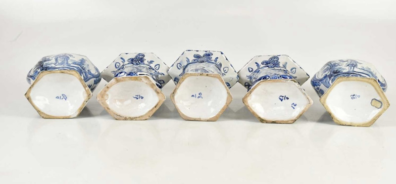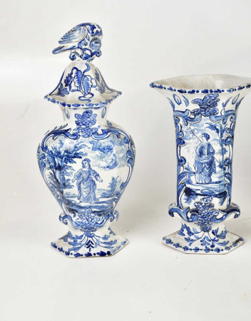 garniture of 3 vases and 2 jars with lids. Classical scenery handpainted I think and the damage showing clay with tin glaze.