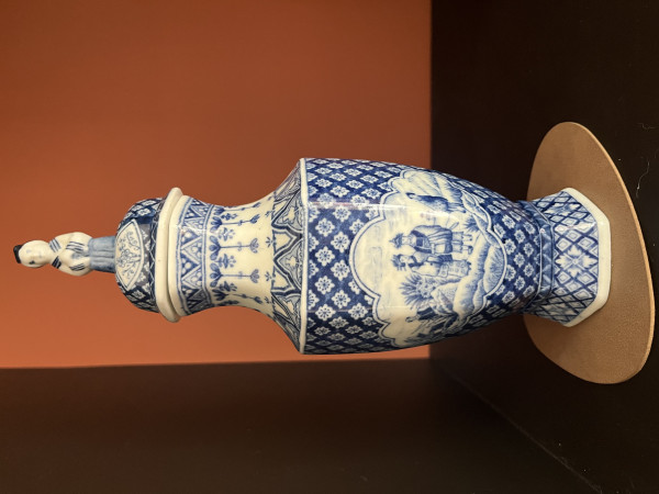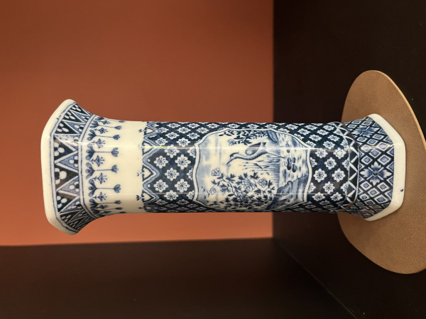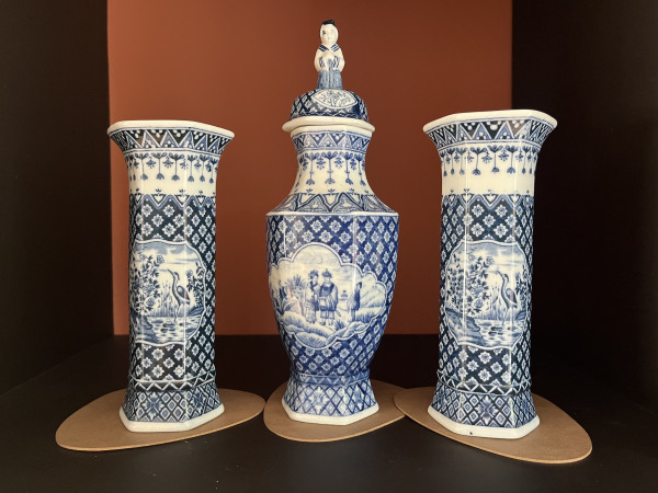 3 zeskantige decoratieve blauw-witte vazen met decoratie van landschap, vogels en figuren