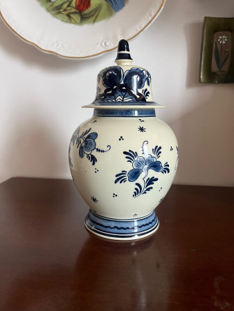 Vintage handpainted Royal Goedewaagen Delft Blue vase with traditional floral motifs. Signed MK and RAU on the base. Perfect condition, mid 20th century.