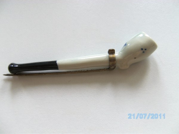 Is het pijpje mogelijk een dasspeld? De vermelding ‘Holland’ duidt niet op de productieplaats maar op het type decor dat is geïnspireerd door traditioneel Delfts aardewerk. Dergelijke objecten werden zoals u aangeeft inderdaad voor de toeristische markt vervaardigd.