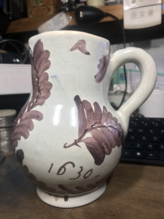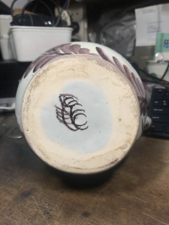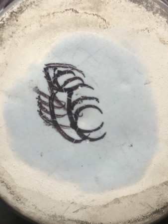 Schenkkan in Mangaan met merk onderzijde met craquelé (echte dus niet meegedecoreerde ) met loupe bekeken . Decoratie opbouw zie detail foto . En jaren in bezit en geen andere gevonden zoals deze op het internet op geen 1 manier dus reverse image search etc etc . Dus puntgaaf maar onderzoek waard naar echte leeftijd ?