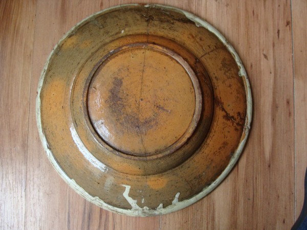 Heb even goed gekeken en lijkt mij inderdaad een afdruk van een proen aan de binnenkant . Rond en middelijn van cm of 8 . Deze kleur groen komt vaak voor op werra keramiek ook gemaakt in Nederland en Duitsland natuurlijk . De vorm incl de rand is ook redelijk gelijk aan die borden . Zou dan wel een oud bord kunnen zijn ?