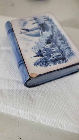Trinket box looks like a book, removable lid, Harbour scene with ships and house and shoreline.